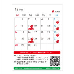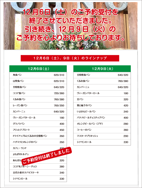 パンのご予約をご希望のお客様は、Contactページのメールフォームより12月6日(土)ご予約の方『12月4日(木)午後1:00まで』12月9日(火)ご予約の方『12月9日(火)午後3:00まで』にお申し込みください。当日中にこちらから返信メールを差し上げます。返信メールが届かない場合はお手数ですが、お電話をいただけるようお願いいたします。また、お電話でのご予約も承っております。パンの引き取りは12月6日(土)、9日(火)ともに午後3:00までにお願い致します。引き取り時間にご希望がある場合はお申し付けください。食パン、カンパーニュのスライスをご希望のお客様は、カット枚数と併せてお申し付けください。皆様のご来店、ご予約をお待ちしています。