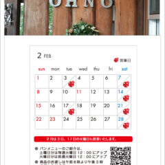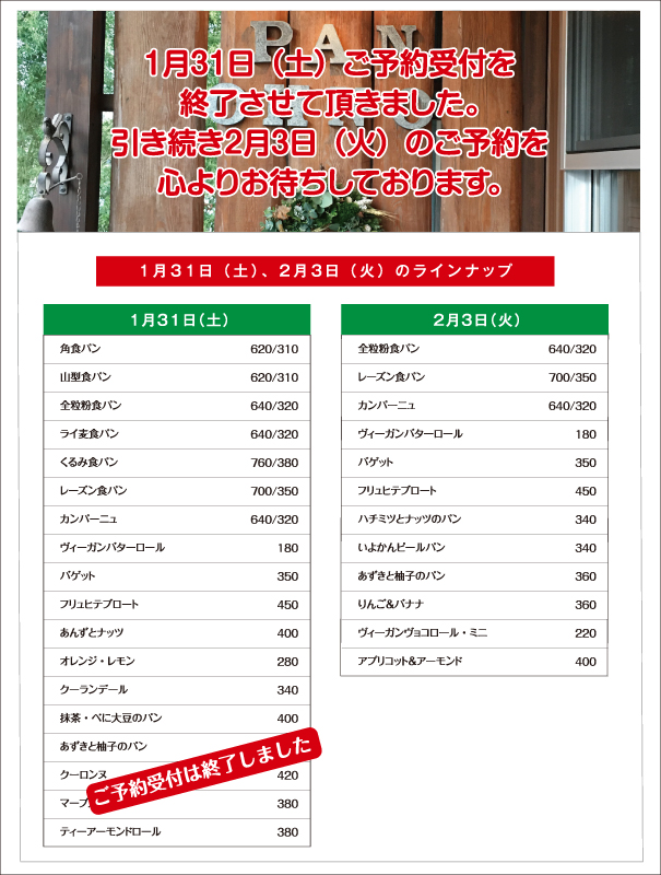 パンのご予約をご希望のお客様は、Contactページのメールフォームより1月31日(土)ご予約をご希望の方【1月29日(木)午後1:00まで】2月3日(火)ご予約をご希望の方【1月31日(土)午後3:00までにお申し込みください。当日中にこちらから返信メールを差し上げます。返信メールが届かない場合はお手数ですが、お電話をいただけるようお願いいたします。また、お電話でのご予約も承っております。パンの引き取りは1月31日(土)、2月3日(火)ともに午後3:00までにお願い致します。引き取り時間にご希望がある場合はお申し付けください。食パン、カンパーニュのスライスをご希望のお客様は、カット枚数と併せてお申し付けください。皆様のご来店、ご予約をお待ちしています。