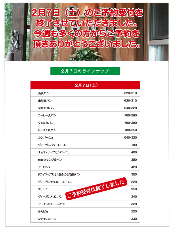 2月7日(土)のご予約受付を終了させていただきました。今週も多くの方からご予約を頂き、本当にありがとうございました。皆さまのご来店を心よりお待ちしております。