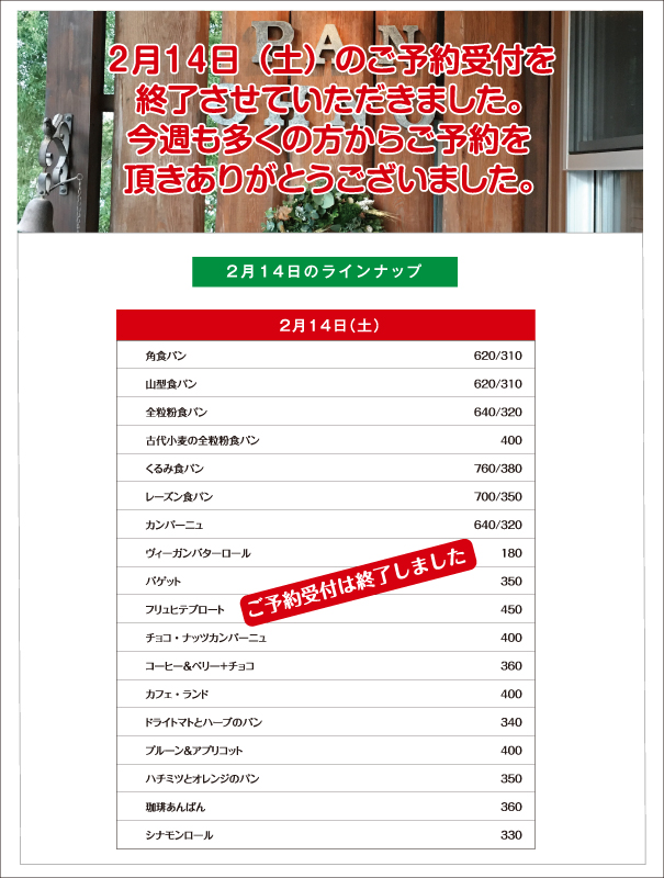 パンのご予約をご希望のお客様は、Contactページのメールフォームより2月12日(木)午後1:00までにお申し込みください。当日中にこちらから返信メールを差し上げます。返信メールが届かない場合はお手数ですが、お電話をいただけるようお願いいたします。また、お電話でのご予約も承っております。パンの引き取りは2月14日(土)午後3:00までにお願い致します。引き取り時間にご希望がある場合はお申し付けください。食パン、カンパーニュのスライスをご希望のお客様は、カット枚数と併せてお申し付けください。皆様のご来店、ご予約をお待ちしています。