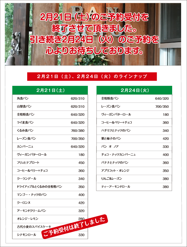 2月21日(土)、2月24日(火)の パンメニューをアップさせていただきます。皆さまからのご予約を心よりお待ちしております。