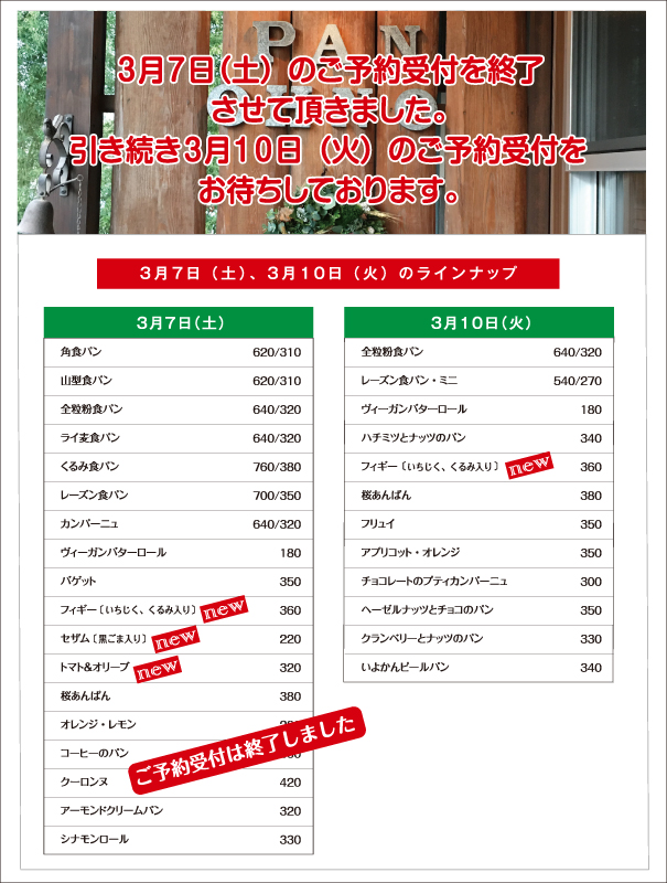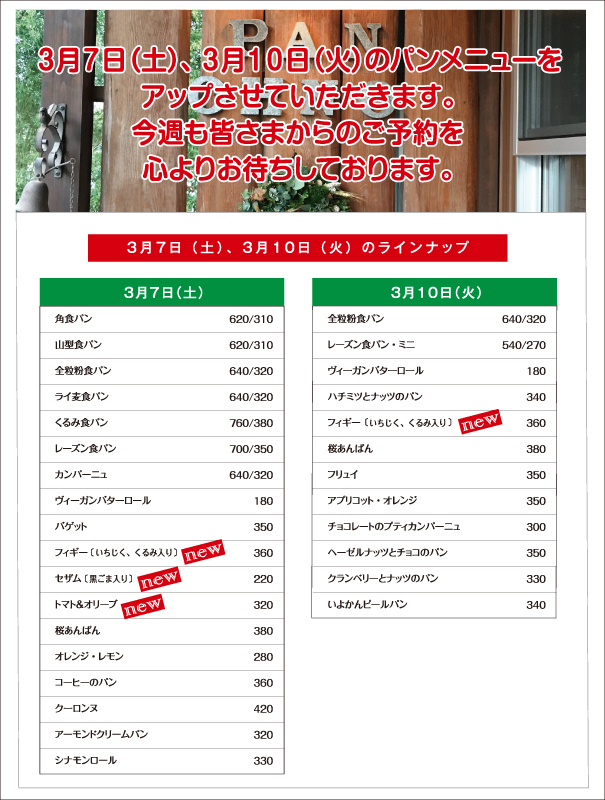 3月7日(土)、3月10日(火)のパンメニューをアップさせていただきます。皆さまからのご予約を心よりお待ちしております。