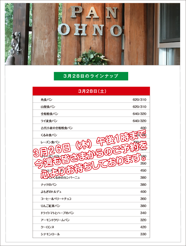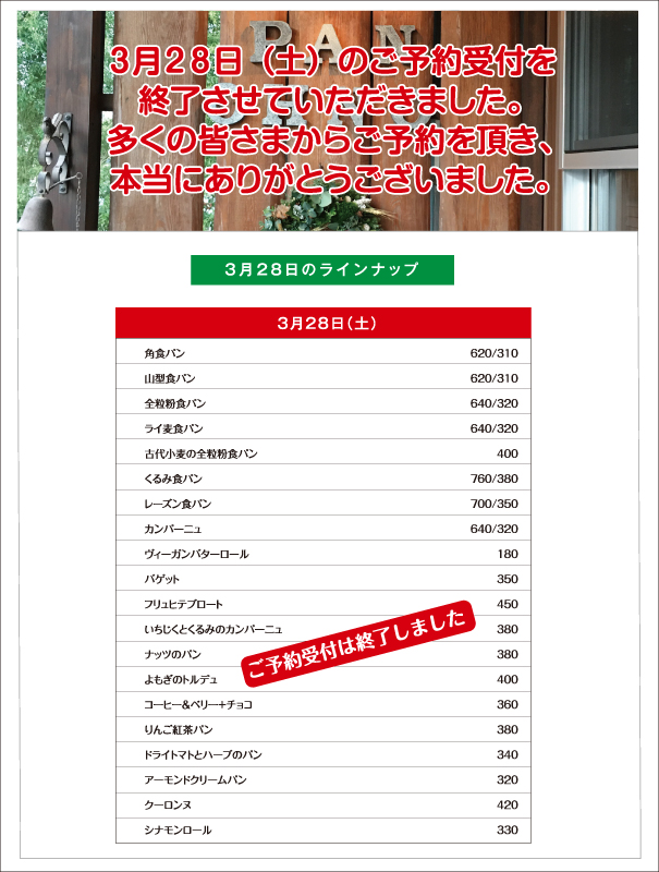 パンのご予約をご希望のお客様は、Contactページのメールフォームより3月26日(木)午後1:00までにお申し込みください。当日中にこちらから返信メールを差し上げます。返信メールが届かない場合はお手数ですが、お電話をいただけるようお願いいたします。また、お電話でのご予約も承っております。パンの引き取りは3月28日(土)午後3:00までにお願い致します。引き取り時間にご希望がある場合はお申し付けください。食パン、カンパーニュのスライスをご希望のお客様は、カット枚数と併せてお申し付けください。皆様のご来店、ご予約をお待ちしています。