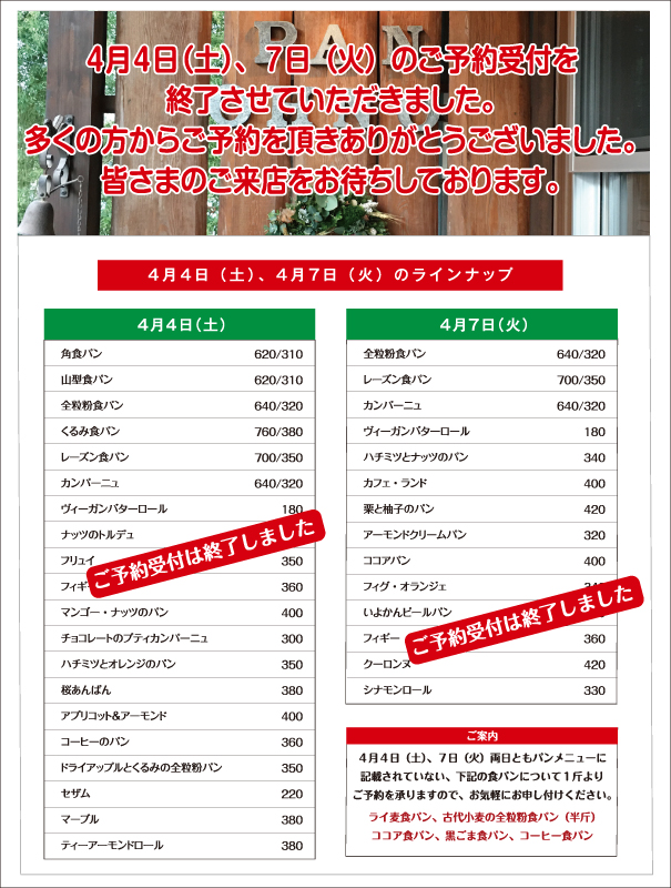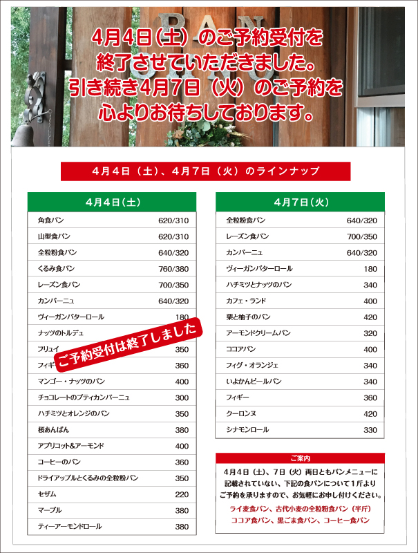パンのご予約をご希望のお客様は、Contactページのメールフォームより4月4日(土)ご予約をご希望の方は【4月2日(木)午後1:00まで】4月7日(火)ご予約をご希望の方は【4月4日(土)午後3:00までにお申し込みください。当日中にこちらから返信メールを差し上げます。返信メールが届かない場合はお手数ですが、お電話をいただけるようお願いいたします。また、お電話でのご予約も承っております。パンの引き取りは4月4日(土)、4月7日(火)ともに午後3:00までにお願い致します。引き取り時間にご希望がある場合はお申し付けください。食パン、カンパーニュのスライスをご希望のお客様は、カット枚数と併せてお申し付けください。皆様のご来店、ご予約をお待ちしています。