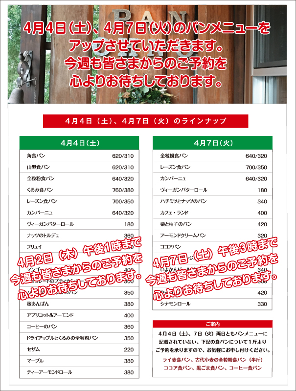 4月4日(土)、7日(火)のパンメニューをアップさせていただきます。今週も多くの方からのご予約を心よりお待ちしております。皆さまのご来店をお待ちしております。