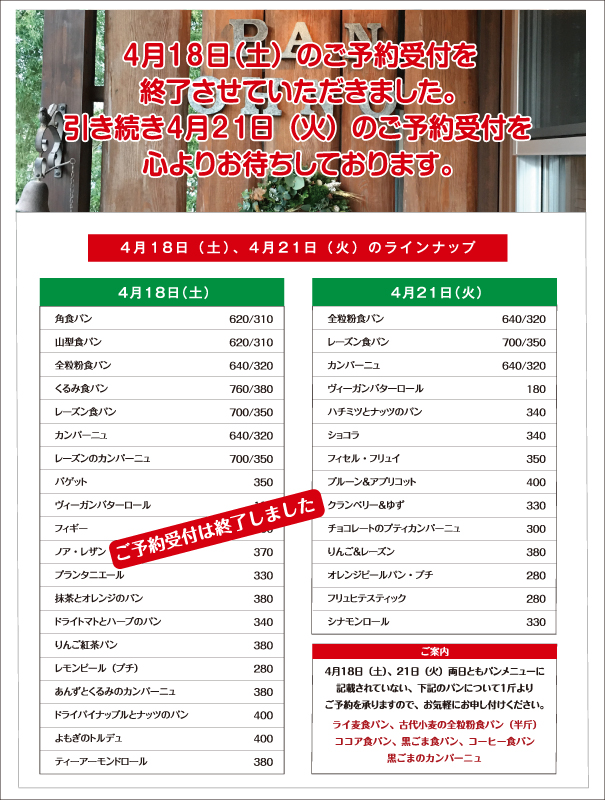パンのご予約をご希望のお客様は、Contactページのメールフォームより4月18日(土)ご予約をご希望の方【4月16日(木)午後1:00まで】4月21日(火)ご予約をご希望の方【4月18日(土)午後3:00までにお申し込みください。当日中にこちらから返信メールを差し上げます。返信メールが届かない場合はお手数ですが、お電話をいただけるようお願いいたします。また、お電話でのご予約も承っております。パンの引き取りは4月18日(土)、4月21日(火)ともに午後3:00までにお願い致します。引き取り時間にご希望がある場合はお申し付けください。食パン、カンパーニュのスライスをご希望のお客様は、カット枚数と併せてお申し付けください。皆様のご来店、ご予約をお待ちしています。
