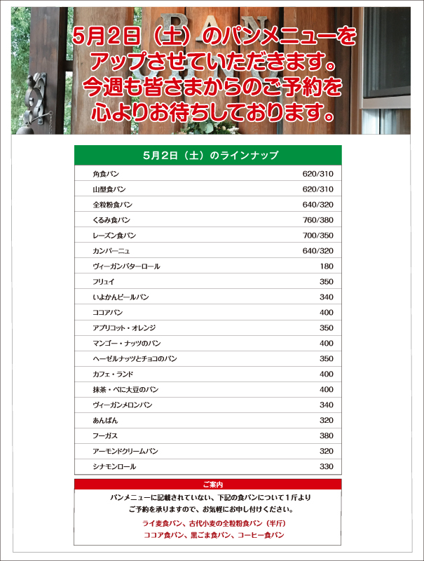 パンのご予約をご希望のお客様は、Contactページのメールフォームより4月23日(木)午後1:00までにお申し込みください。当日中にこちらから返信メールを差し上げます。返信メールが届かない場合はお手数ですが、お電話をいただけるようお願いいたします。また、お電話でのご予約も承っております。パンの引き取りは4月25日(土)午後3:00までにお願い致します。引き取り時間にご希望がある場合はお申し付けください。食パン、カンパーニュのスライスをご希望のお客様は、カット枚数と併せてお申し付けください。皆様のご来店、ご予約をお待ちしています。