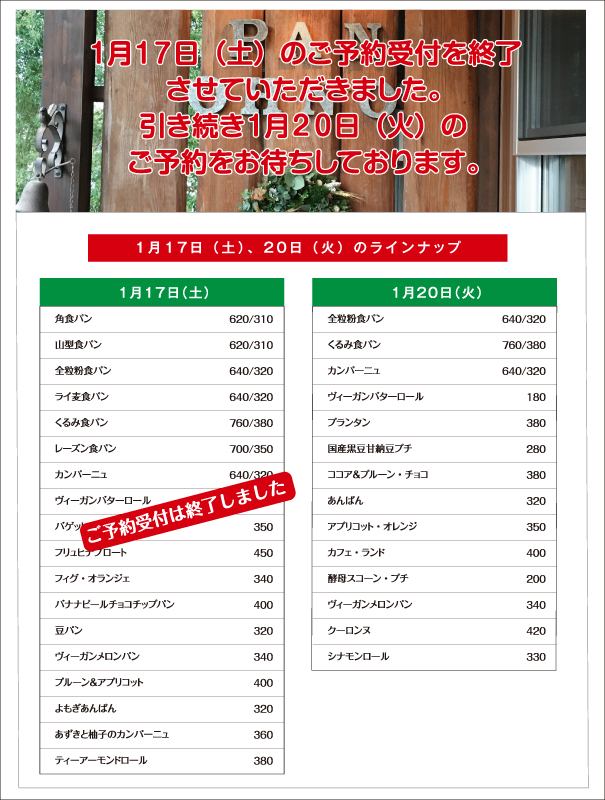 パンのご予約をご希望のお客様は、Contactページのメールフォームより1月17日(土)ご予約をご希望の方【1月15日(木)午後1:00まで】1月20日(火)ご予約をご希望の方【1月17日(土)午後3:00までにお申し込みください。当日中にこちらから返信メールを差し上げます。返信メールが届かない場合はお手数ですが、お電話をいただけるようお願いいたします。また、お電話でのご予約も承っております。パンの引き取りは1月17日(土)、1月20日(火)ともに午後3:00までにお願い致します。引き取り時間にご希望がある場合はお申し付けください。食パン、カンパーニュのスライスをご希望のお客様は、カット枚数と併せてお申し付けください。皆様のご来店、ご予約をお待ちしています。