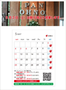 5月3日(土・祝)は朝、6時より営業いたします。皆様のご来店を心よりお待ちしております。…