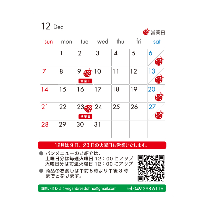 2025年12月の営業日カレンダーです。朝夕はめっきり寒くなりいよいよ冬到来という季節になってきました。12月は9日(火)、23日(火)も営業いたします。シュトーレンをはじめとして冬に食べていただきたいパンをラインナップして皆さまのご来店を心よりお待ちしております。